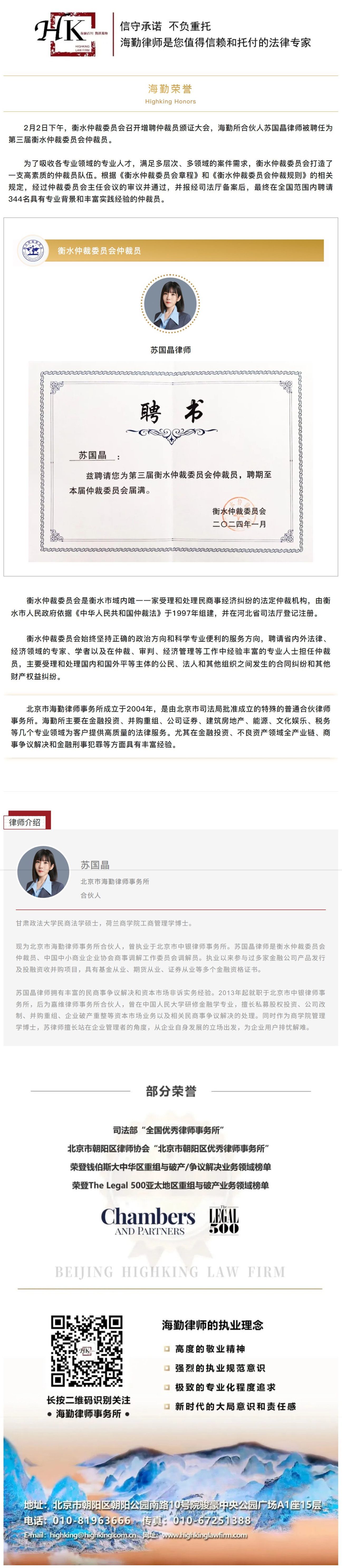 海勤荣誉 | 海勤所合伙人苏国晶律师荣聘第三届衡水仲裁委员会仲裁员